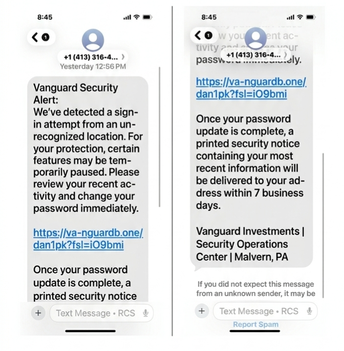 One IVA reader recently shared an experience that’s worth highlighting. As you can see in the screenshots below, he received a message that appeared to be from Vanguard—flagging an unrecognized login and urging him to change his password immediately.